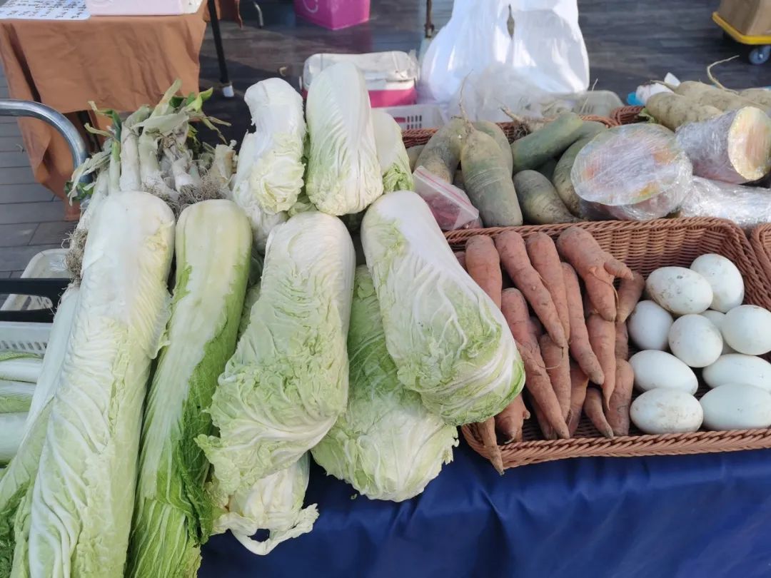 在这一天里,上午,集室里是忙碌的收菜、卖菜,集室外是农友们的年货市集。中午,值日做饭的农友端出来足够30人吃的午餐,食材也都来自大伙们。