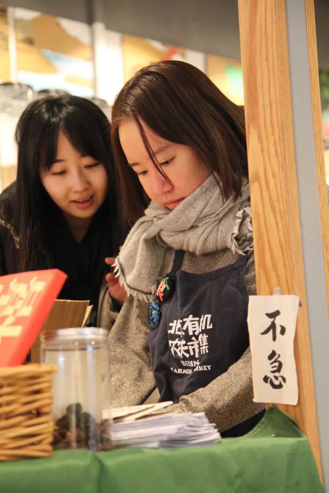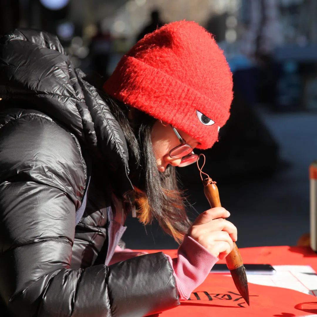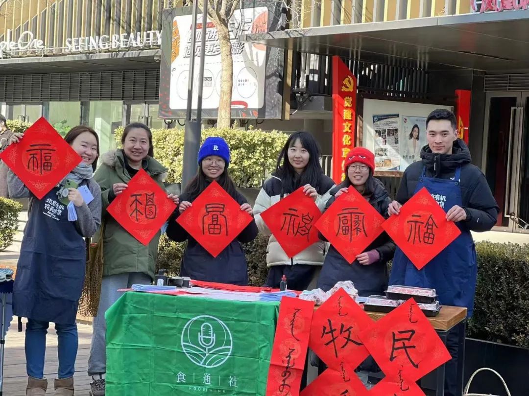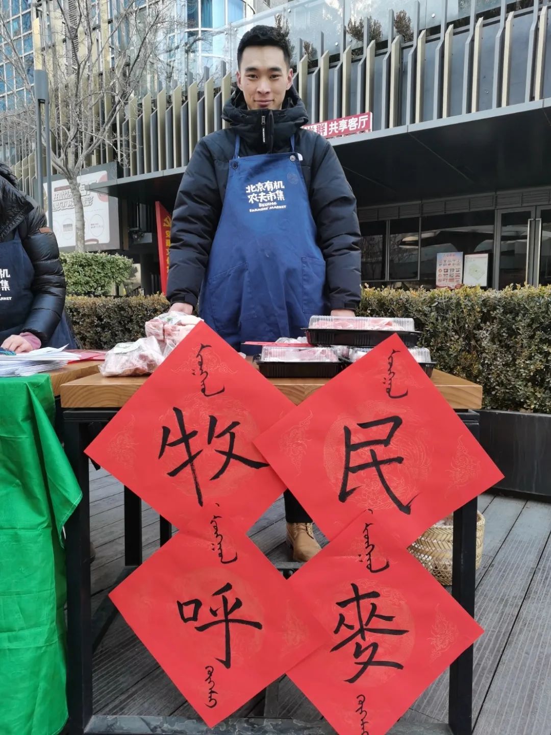 这次占领集室,我的职责是在店外的农夫市集写福字送给来赶集的消费者,得空了也帮隔壁摊位的牧民朋友苏和吆喝着卖羊肉。