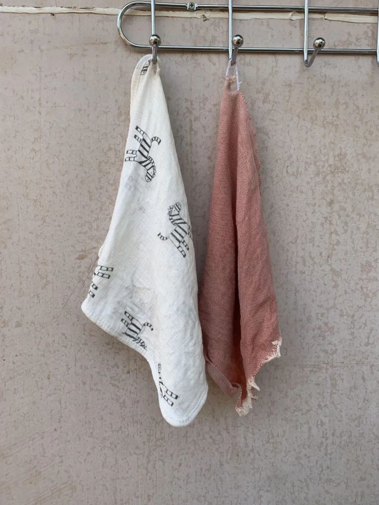 旁边那一条也是纯棉材质,极细纱支的机纺、机织,化学原料印染,是条品质良好的婴儿帕。这不是买的而是捡的,得自高雄捷运二楼餐饮区。那次与一位朋友有约,从捷运站出来经过一家餐馆时在门口地上见到,不难想像是从一辆婴儿车上遗落的。回程再次经过,它还在那里,只是更脏了一点儿,多了一些脚印。估计再过一阵,下班打扫卫生时就会投进垃圾箱,于是捡了回来。