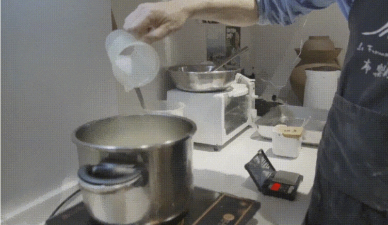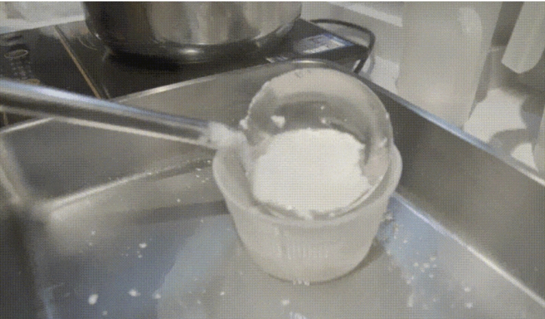 PH值达到合适酸度时,用70度左右的热水烫凝乳,直到它变软,变得有韧性,反复折叠、拉扯,可以捏成圆圆的球。最后放入冷水中定形。