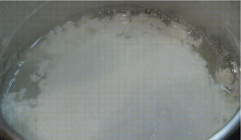 然后继续加热到80-90度。在这个过程中,我们可以看到乳清会呈絮状漂浮在乳清水上边,就可以关火了。