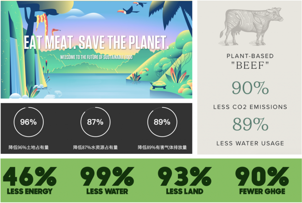 大部分植物肉品牌都将环保作为主要卖点之一。高调如“不可能食品”,更是直接将“吃肉救地球”的口号打在网站首页,还把产品的环保性能印在了包装上显眼的位置。