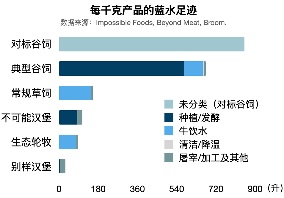 相比之下,植物肉只需要考虑种植原料的灌溉、化肥农药的污染,以及食品加工用水。其中,让“不可能汉堡”呈现渗血效果的豆血红蛋白要通过转基因酵母菌发酵制成,需要较大量的水,也会相应产生废水。若像“别样汉堡”(Beyond Burger)那样不玩这些高科技,蓝水用量就会比生态轮牧还低。