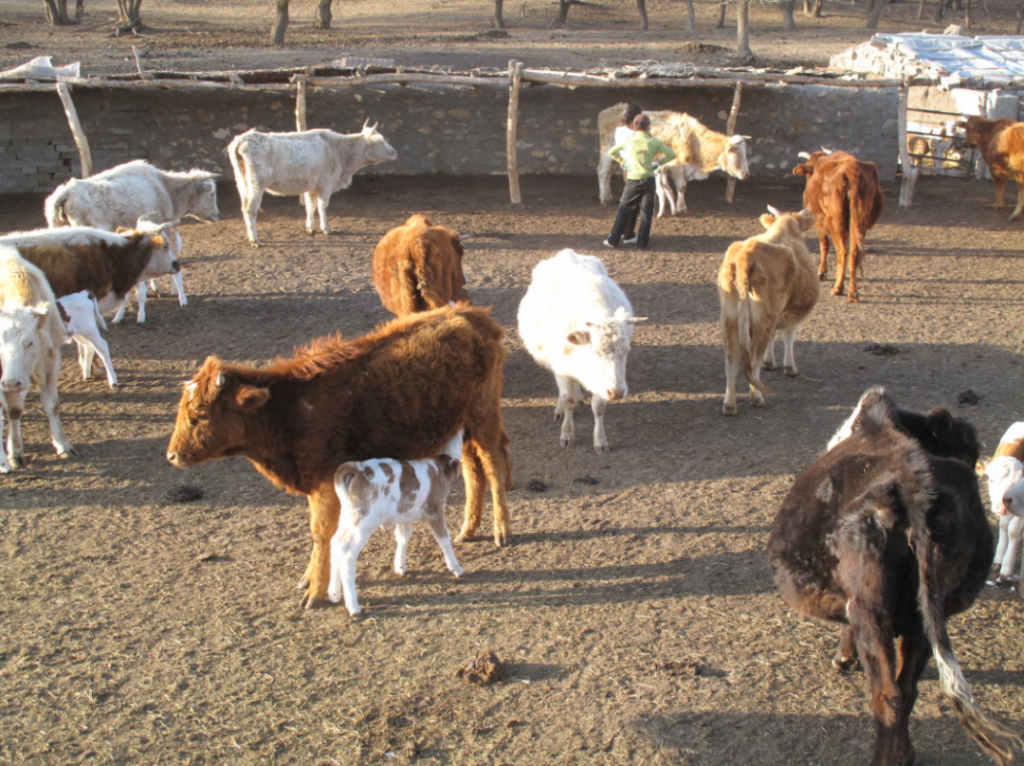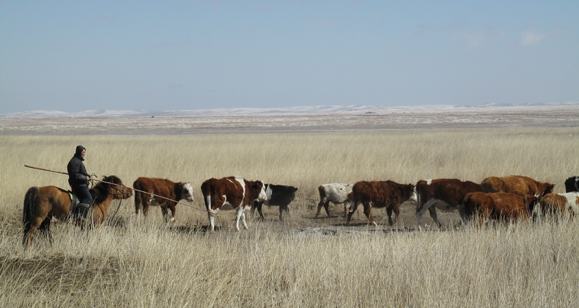 这在养牛的地区尤其明显。现在牧民只负责繁育牛犊,等小牛的骨骼长得差不多了,就拉到育肥厂去统一育肥。在棚圈饲养的条件下,增肥少的传统蒙古牛几乎没有优势,引进的西门塔尔牛的肉量却能在几个月内翻倍增长。