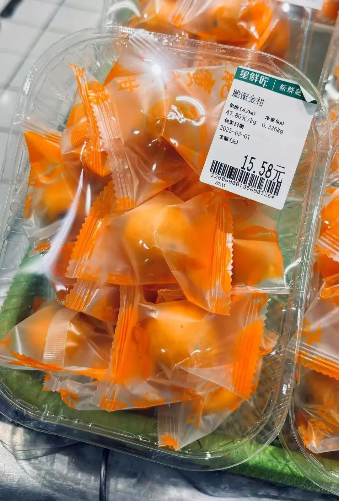 @志超(男 38 北京 “邮差慢递”活动发起人):超市买菜时标签码必须贴在袋子上,所以就导致每个菜必须有一个塑料袋装。还有逛超市看到的这种由一个个小袋子独立包装,又被塑料膜封在塑料盒里的脆蜜金柑。