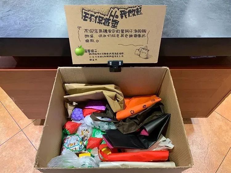 开始是在店铺的收银区设置了一个共享购物袋的箱子,让顾客把家里闲置的袋子放进去,忘记带购物袋的就可以免费从那里拿。中间也会有一些声音说不放心别人的袋子,毕竟是要接触食品的。对那些我们就不理会,反正不想用的不用就是了。后来又和一个顾客所在的工厂合作,用婴儿车的余料做了一些购物袋,零利润销售,也可以用积分兑换。