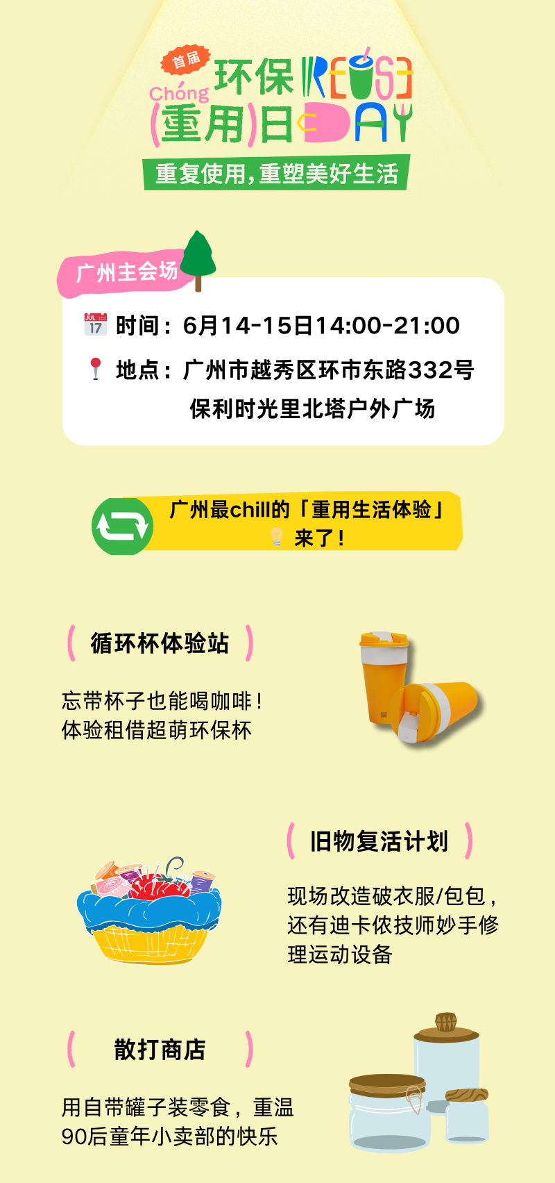 @摆脱塑缚(广州):如果大家想了解摆脱一次性塑料生活的解决方案,欢迎参加这场减塑又好玩的“环保重用日”市集!你可以在这里体验到循环咖啡杯、专业运动装备维修、“打酱油式”购物、旧物二手交换等绿色生活创意,和众多摊主们一起,找到适合你自己的可持续生活方式。