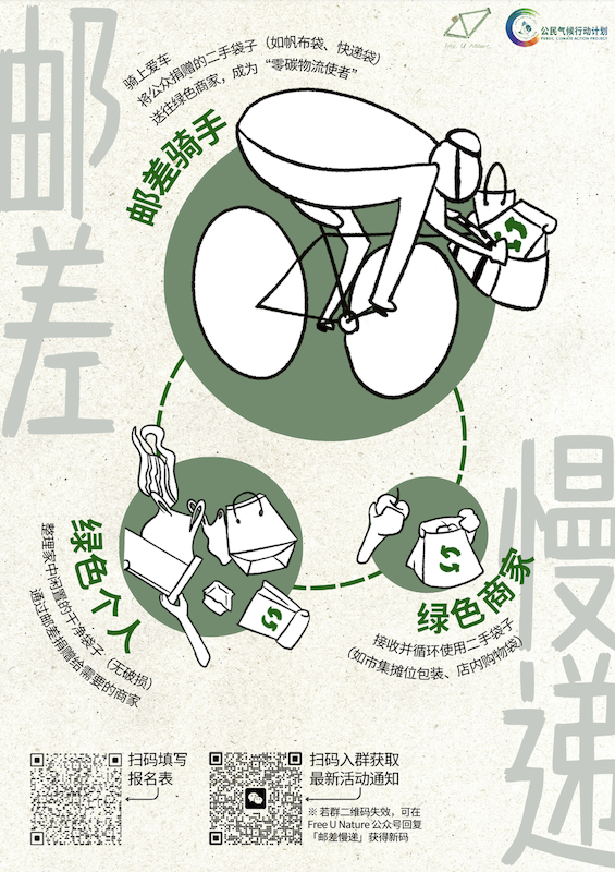 欢迎扫描下方海报二维码加入Free U Nature成为邮差骑手,当快递越来越快,塑料垃圾堆积如山,我们一起用自行车轮和旧物循环来对抗气候危机。