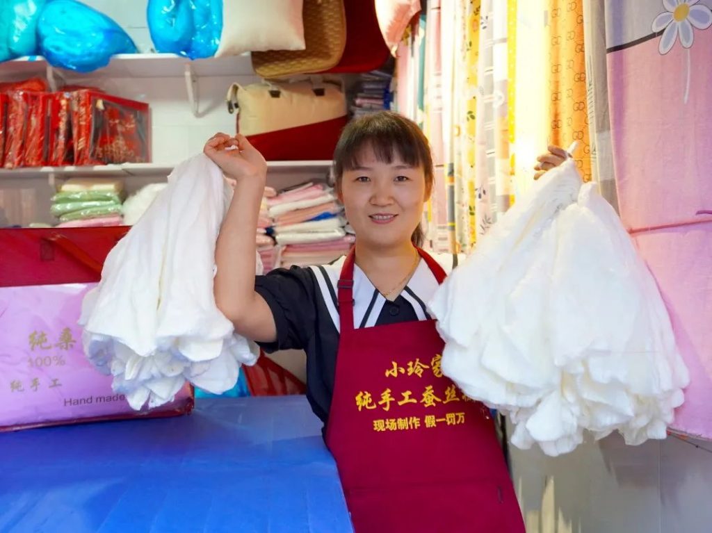 知道我要拍照,小玲姐赶忙找出了店里最珍贵的蚕丝面料,一手一捆地拎着,很是骄傲。这就是小生意人踏实做生意、不假不骗的自信!