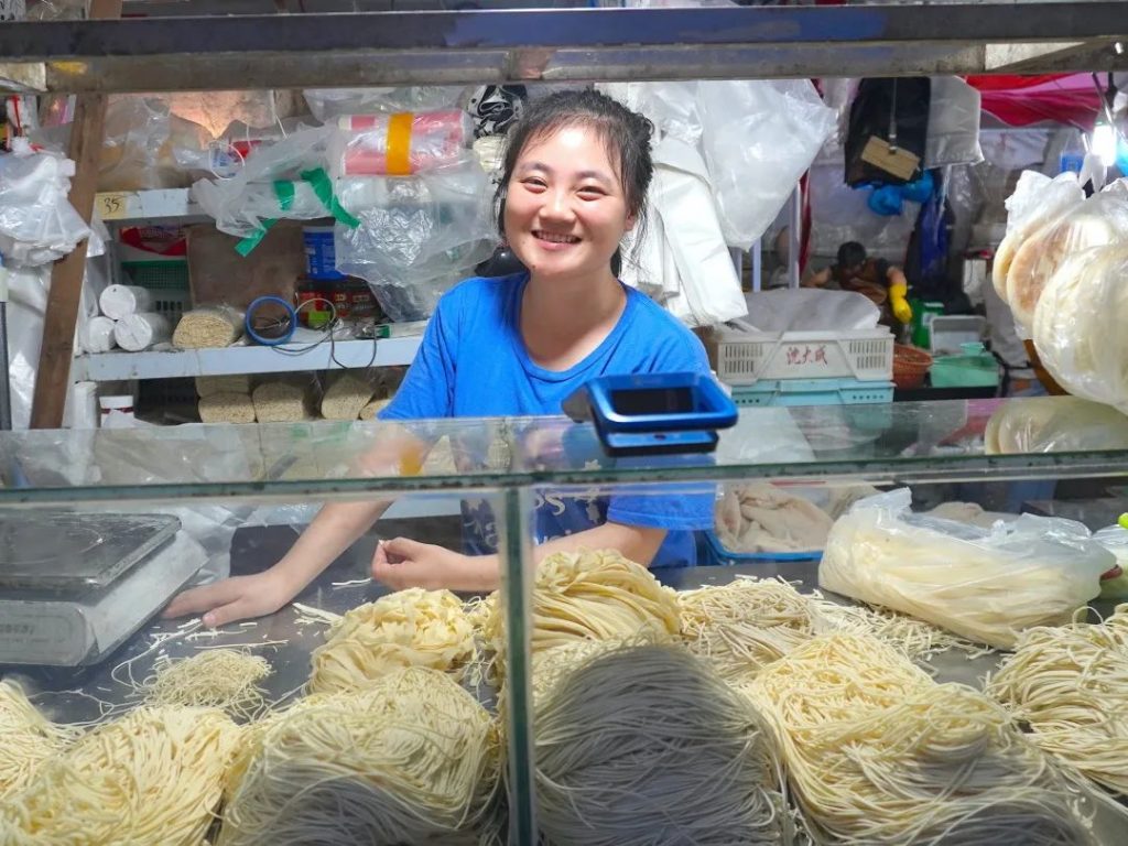 走进王家宅菜市场,远远看到一位头发花白的老奶奶,佝着腰在面摊前驻足了很久,似乎在和里面的人交谈着。我觉得奶奶很可爱,又想走近看看是哪一位摊主这么耐心地和奶奶说话呢,于是就看到吴姐啦,真的是人美心善。