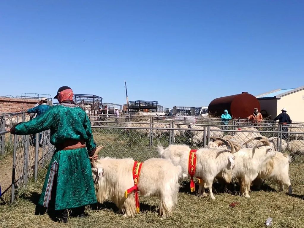 我到现场时刚过正午,远远就看见畜栏里羊只踏起的尘土,栏边则围满了牧民,他们大都穿着做工精美、颜色亮丽的传统蒙古袍,非常好看。我不懂蒙语,却被牧民们有说有笑的气氛所感染,四处打量观望,只觉得一切都新鲜。