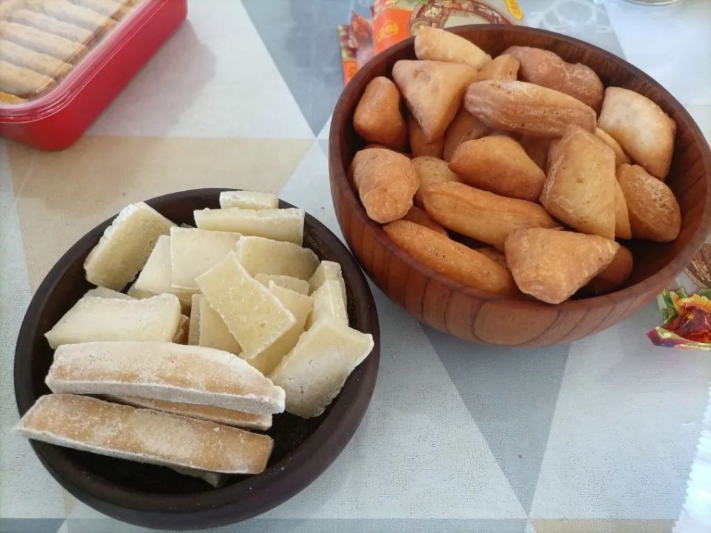和手把肉一起泡奶茶吃的,还有都兰家自制的两种奶豆腐。生奶豆腐更接近生牛乳味,熟奶豆腐则散发着微酸的发酵香味,颜色也更深。