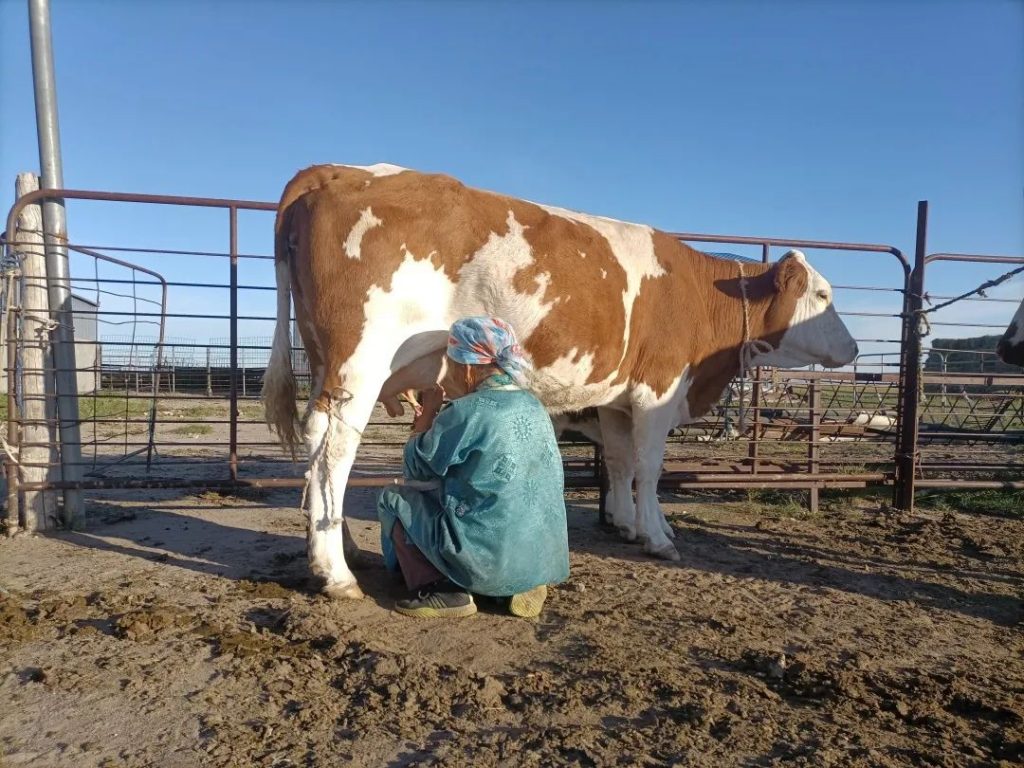 在牧区,一个普通的六口之家每天喝奶茶、吃奶豆腐,总共需要多少牛奶呢?第二天早上,拴在栏边的4对奶牛给了我答案。