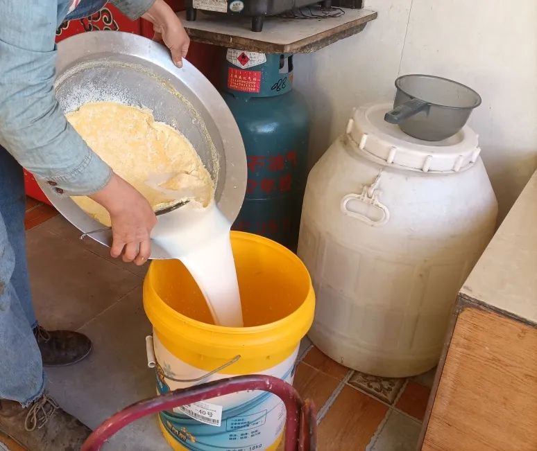 取出奶皮子,锅里剩下的牛奶倒进木桶后发酵就是做熟奶豆腐的原料。这个过程更复杂费工。