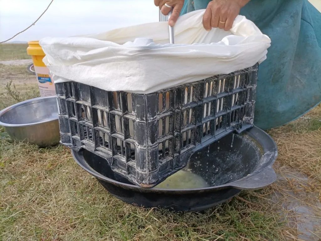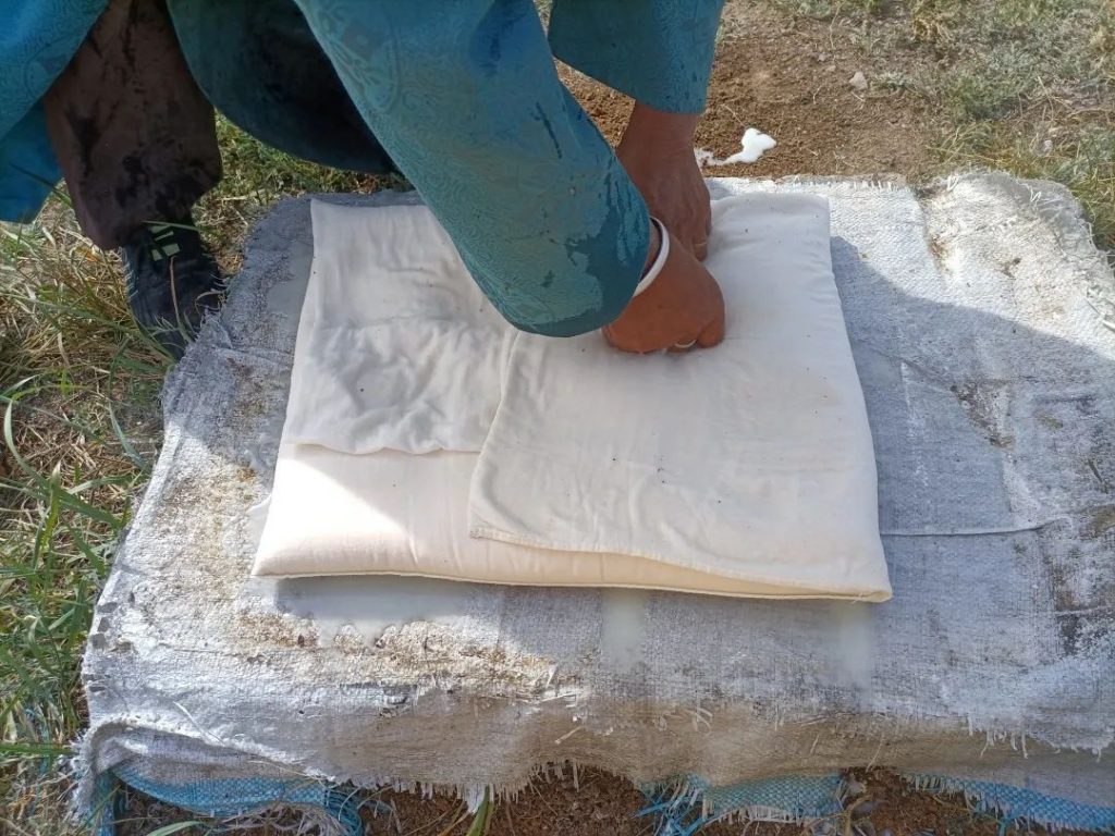 发酵好的奶还要再煮一遍,煮至粘稠就可以装进纱布,压到大石头下面等待成型。切成小条后自然风干,就是最后一道工序了。