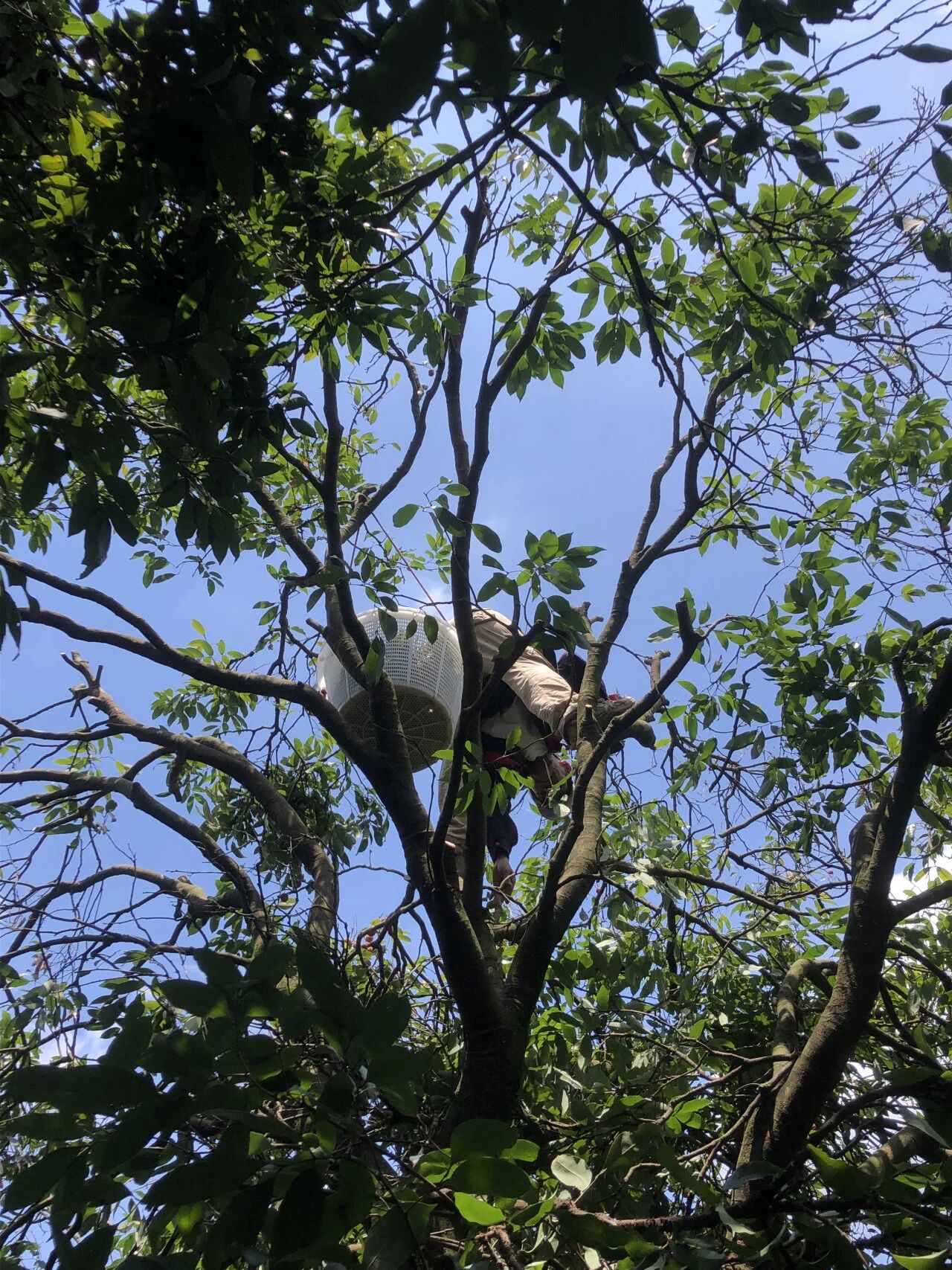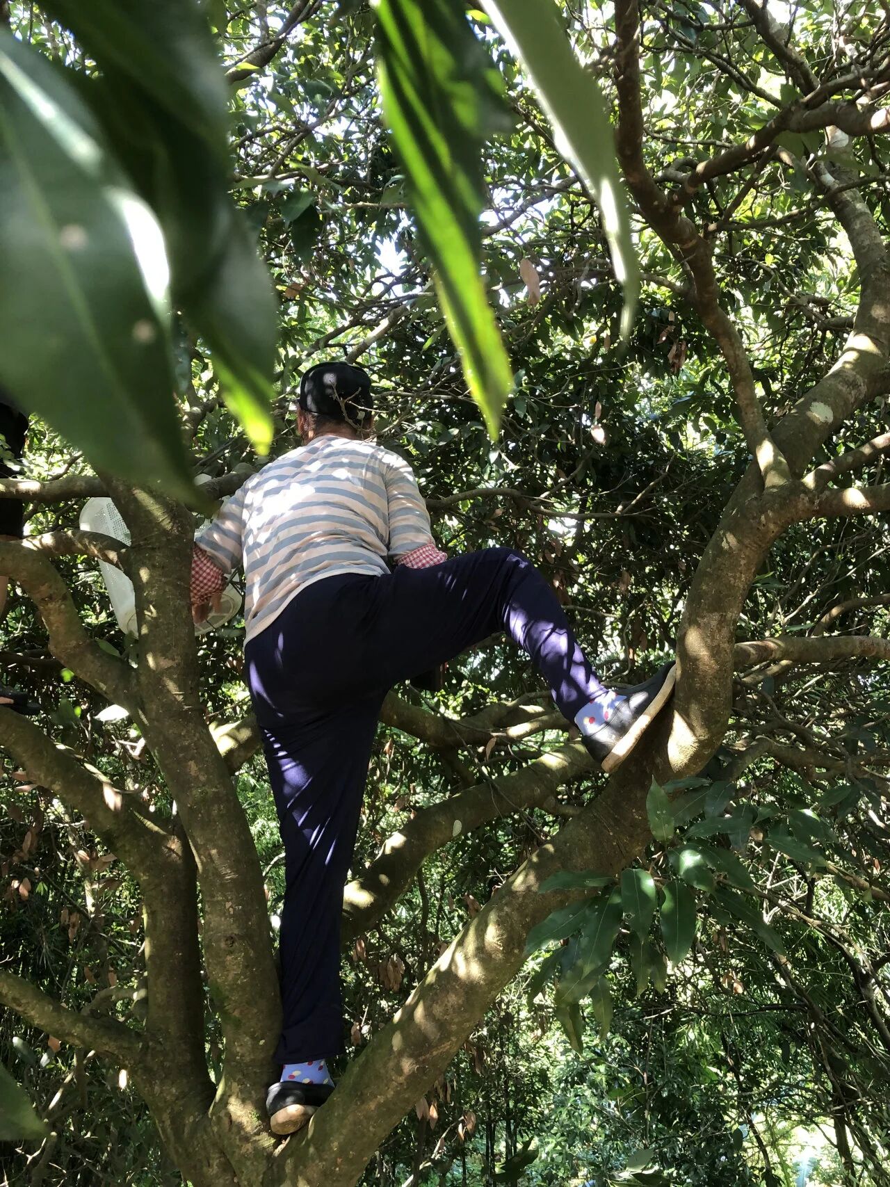 眼前的糯米糍、桂味荔枝树,便是阿姨们当年开荒时种下的。银林农场的负责人郭锐打量着粗壮的树根,估摸着树龄得有五十年了。但亲历其事的阿姨们却语气笃定:“哪有那么久?是八十年代某个好天种下的,就三十年!” 她们和郭锐身手矫健,三两下便攀上粗壮的枝干,利落地剪下挂满果实的枝条。在树下可得留神,稍不留神,就可能被坠落的荔枝、断枝、甚至枝条间悬着的蜂窝或鸟窝砸中。而那高悬枝头、最接近天空的果实,风味总是最为浓郁。