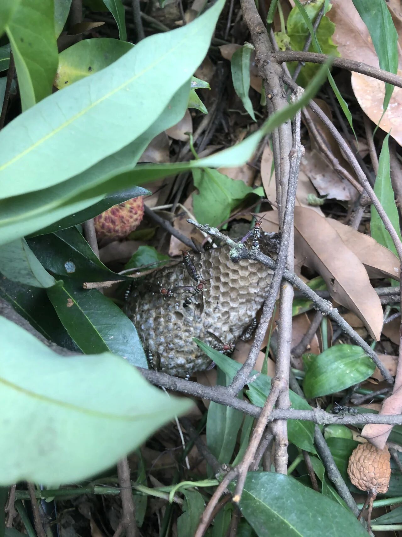 马师傅会双掌合拢做喇叭状,大声发出“胡-嘟-嘟”,有时是“呼-噜-噜”的声音来驱赶鸟。她说这是鸟叫声,我们对此保持怀疑,但一轮声音过后,食果的鸟确实会消停一阵。五月,山间到处都是雨水,天气和心情都是泥泞的,蓝莓沾多了雨,变得水呼呼的,更多的蓝莓被雨打落在地上,鸟和鸡都来不及吃上,都留给土壤了。六月也要结束了,蓝莓没有了,山谷里的荔枝树结果了,鸟和鸡又回到荔枝树旁,沙坑还是在蓝莓树下。