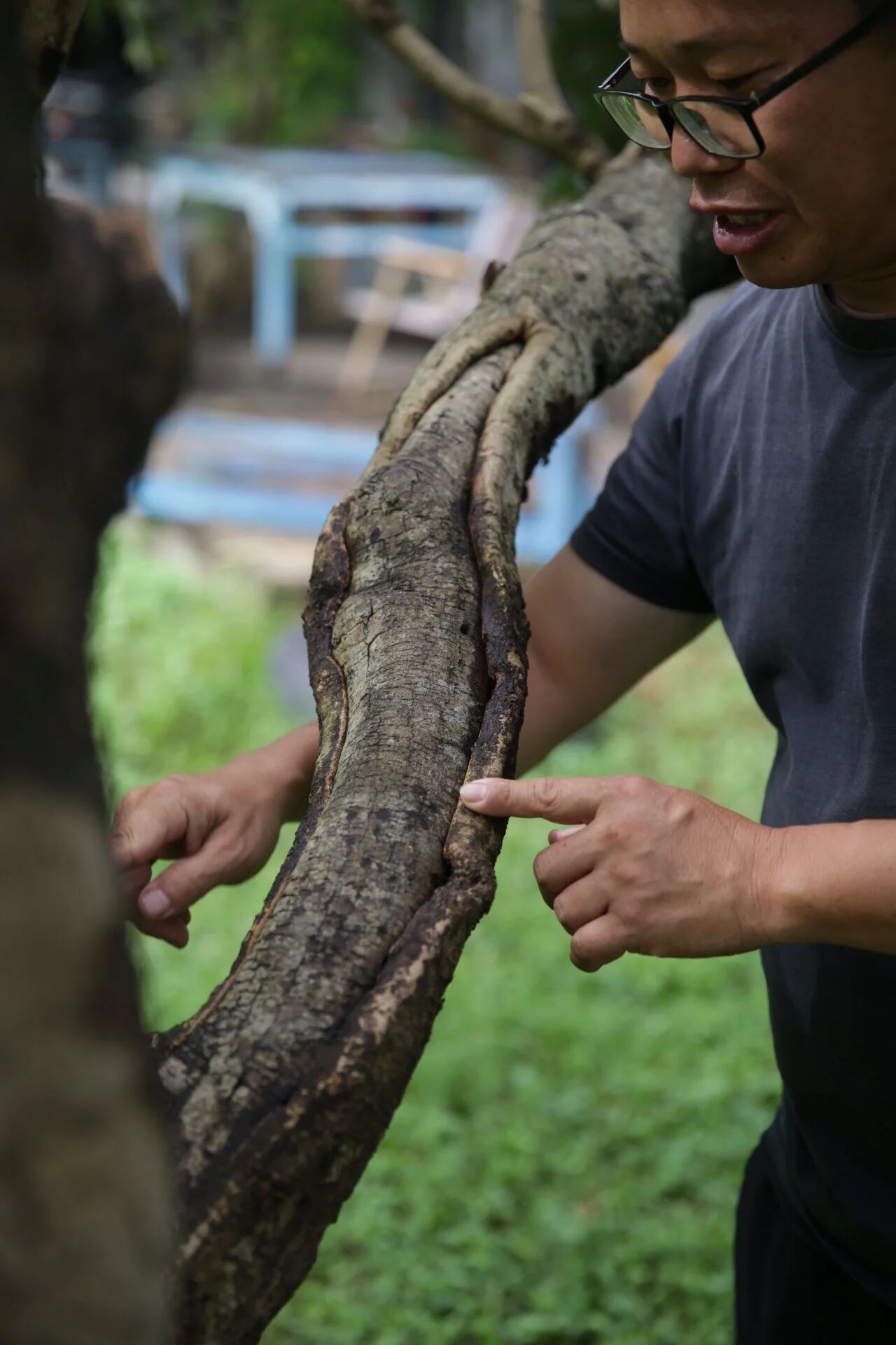 多年来,郭锐对自家荔枝树奉行自然农法的“无为”之道:让它们自由生长,只施以最小干预,更多是持续观察。他指着树干上一处裸露着条状伤痕的树皮说:“这棵树曾被虫子啃掉大片树皮。发现后,我们剪除了树顶枝叶,让阳光倾泻而下,这才驱走了害虫。当年它结的果子就又酸又涩,品质极差。”想象树传输养分的血管淤塞,酸涩被淤积在果实里,当年的荔枝果就好似树颗颗滚落的眼泪。如今,新生的树皮从伤口边缘向上愈合,缓慢地裹上曾经的创伤。