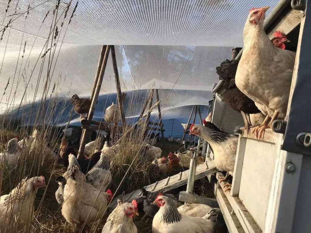 透过一米多高的干草,隐约能看到百米远处支起的白色纱帐。纱帐下是两辆新式的移动鸡棚(Chicken Mobile),母鸡就在移动鸡棚周围的草丛里觅食。距离这么远,我当然看不到那些母鸡,但我能听到她们发出的低频率咕咕声,这说明她们感到很安全。