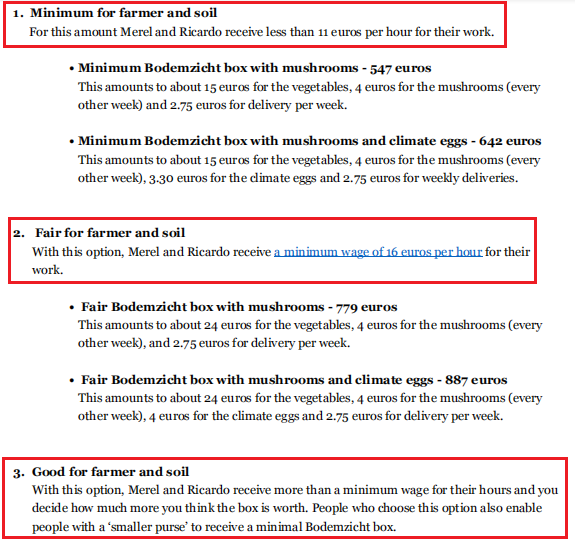 而在Bodemzicht农场,订购计划的3个价格档位是和生产者的时薪挂钩。如果所有人都以“最低价”(Minimum)购买,那么生产者每付出1小时的劳动,只能拿到11欧元。“公平价”(Fair)则和荷兰政府建议的个体经营者最低工资标准16欧元/小时保持一致。如果大家都选择支付“好价钱”(Good),生产者就能过上更体面的生活。
