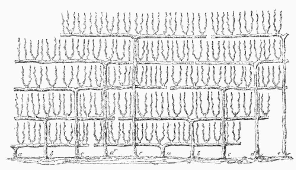 果墙出现在所谓的小冰期(Little Ice Age)的开端,那是欧洲特有的一段寒冷时期,大约从1550年持续到1850年。在果墙技术传开之后,法国人迅速开始通过修剪果树枝来改进这门技术,使得果树可以固定在墙上的木框上。