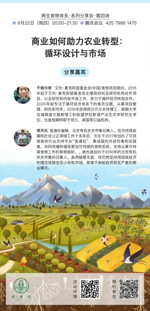 9月22日(本周四)晚8点,本文作者策划的“再生食物系统”分享会的最后一期,今奇也将为大家介绍国际上食物循环设计创新理念。以及食品企业和零售商如何通过以设计为导向的新方法,重新考虑食物所使用的原料和生产方式,使自然向好的食物成为主流,让食品企业做出对消费者、农民和气候都更有利的决策。欢迎加入讨论,扫描下方二维码可预约参会。