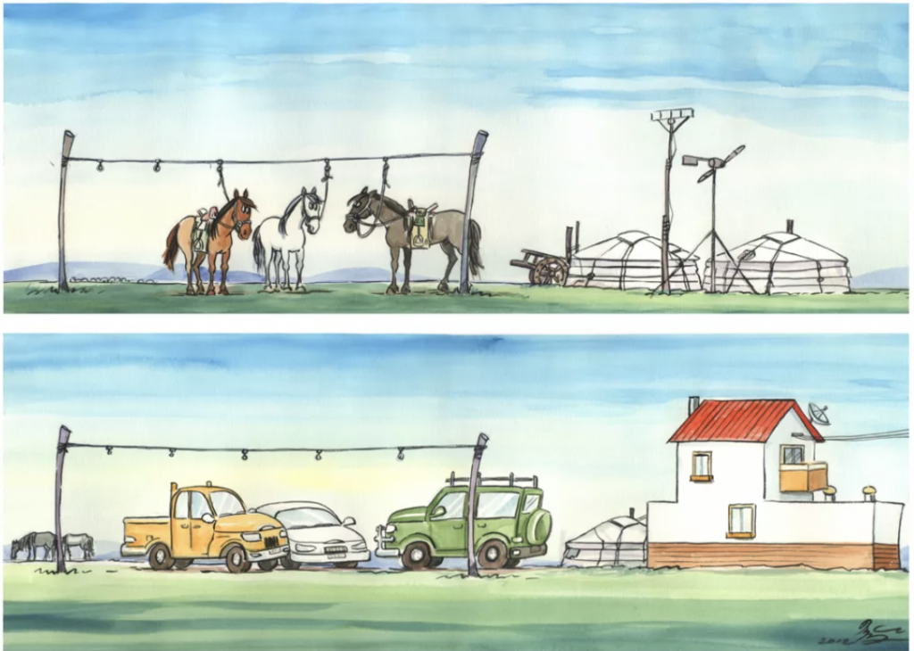 第一,不要为了迎合公众的认知而回避变化。大家心目中的蒙古人家,就是美丽的草原上,浩瀚的天空下只有一个洁白的蒙古包。但是现在牧区的房子通常都比蒙古包更大,旁边有太阳能板、风车,门口还停了一辆汽车。比起几十年前,草原的景观改变了很多,但是很多新闻报道回避了变化,呈现出来的永远都是那个蒙古包,会让大家误以为草原一直是那样。