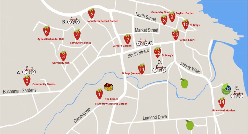 像我常去的Albany Park这样的社区菜园(位于地图右下方),在圣安德鲁斯大学的校园内有14个。我们可以看到,位于地图上方的北街(North Street),市场街(Market Street)和南街(South Street)就是小镇内三条主街,大部分的社区菜园都分布在这三条街上的学生宿舍和教学楼周边。