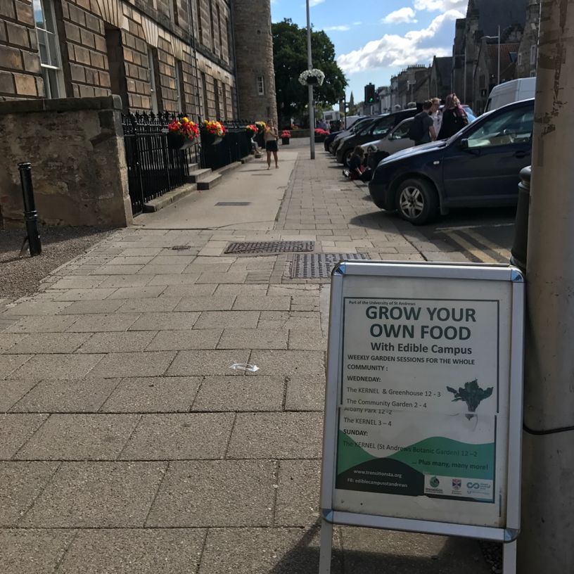 在圣安德鲁斯街道上的“可食校园”宣传海报。海报鼓励公众种植自己的食物,还给出了每周大家可以参与到菜园管理中的时间和地点。