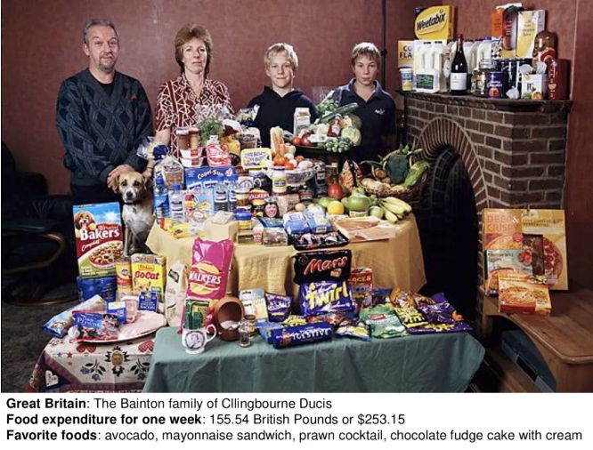 英国政府建议的一周健康饮食开销大约每人每天9英镑(约87元)。对最低收入家庭来说,这意味着花掉可支配收入的45%–70%。因此在现实中,低收入群体每人每天仅花约4英镑(约38元)购买食物,不到政府建议的一半。