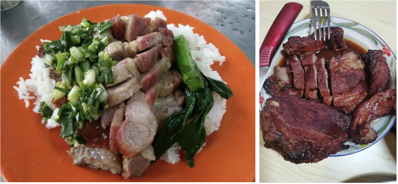 在堂食和外卖的部分,作者给出了这么一份餐厅的菜单:蜜汁叉烧150g、土豆丝100g、青豆100g、米饭200g。暂且不论广东人会不会这么“亵渎地”搭配一顿正餐,好歹这一餐勉强可以认为是一人份的套餐。