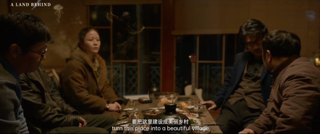 小余刚一坐下,就被招呼快来尝尝今天现杀的牛肉。汤老师用眼神和手势安抚小余,小余点了点头,展现一种出了合时宜的“识大体”。但她实在是伤心的,汤老师几番示意让她倒酒喝酒,而她只是温顺而沉默的坐在那里。在醉话与真语之间,村长喊出口号,要“让大家记住乡愁”,“要把这里建设成美丽乡村”。在农场所遇的诸多困境之中,包裹在“美丽乡村”建设话语里的基层政治漏出了一个边角。