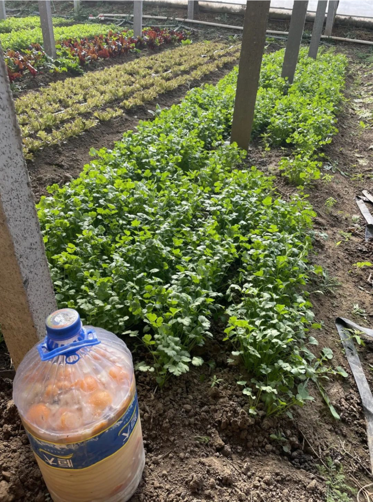 温度没法和暖棚相比,但适合对温度要求不高的越冬叶菜,如菠菜和青蒜。这里的菠菜从十一月份一直供应到了二月份,很快要卖完了。