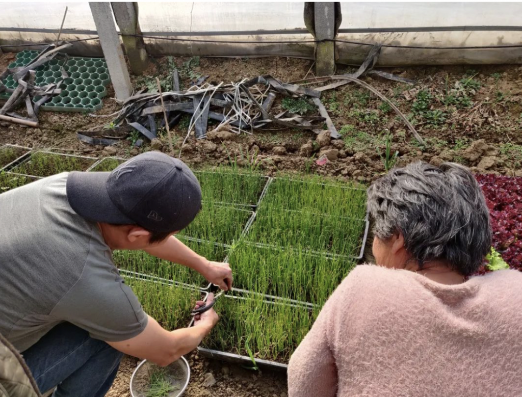 “我们的种子特别贵,这些洋葱种子就要好几百块,间苗太可惜了。这样剪,我可以把剪下来的部分拿回家做菜,剪上三次就差不多了,不浪费。”