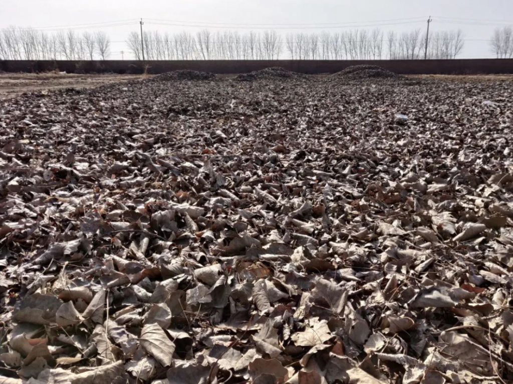 大棚外的土地光秃秃的,这是北方冬天的常见景象。只有几块地覆盖着厚厚的落叶,用来给下面的越冬大蒜和豌豆保温。和许多生态农人一样,柳哥很注意利用农场内部的资源,每年也会把落叶和秸秆打碎翻进土里,让养分循环起来。