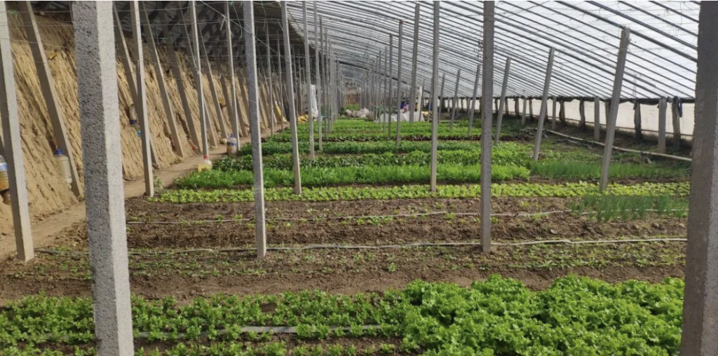 出了暖棚,我们又来到农场的冷棚。所谓冷棚,就是没有夯土墙,只有钢架结构和塑料膜的大棚。一些蔬菜还会额外附加一层塑料膜用来保温。