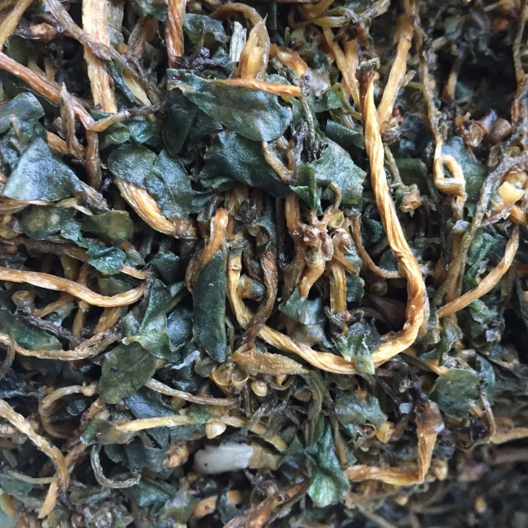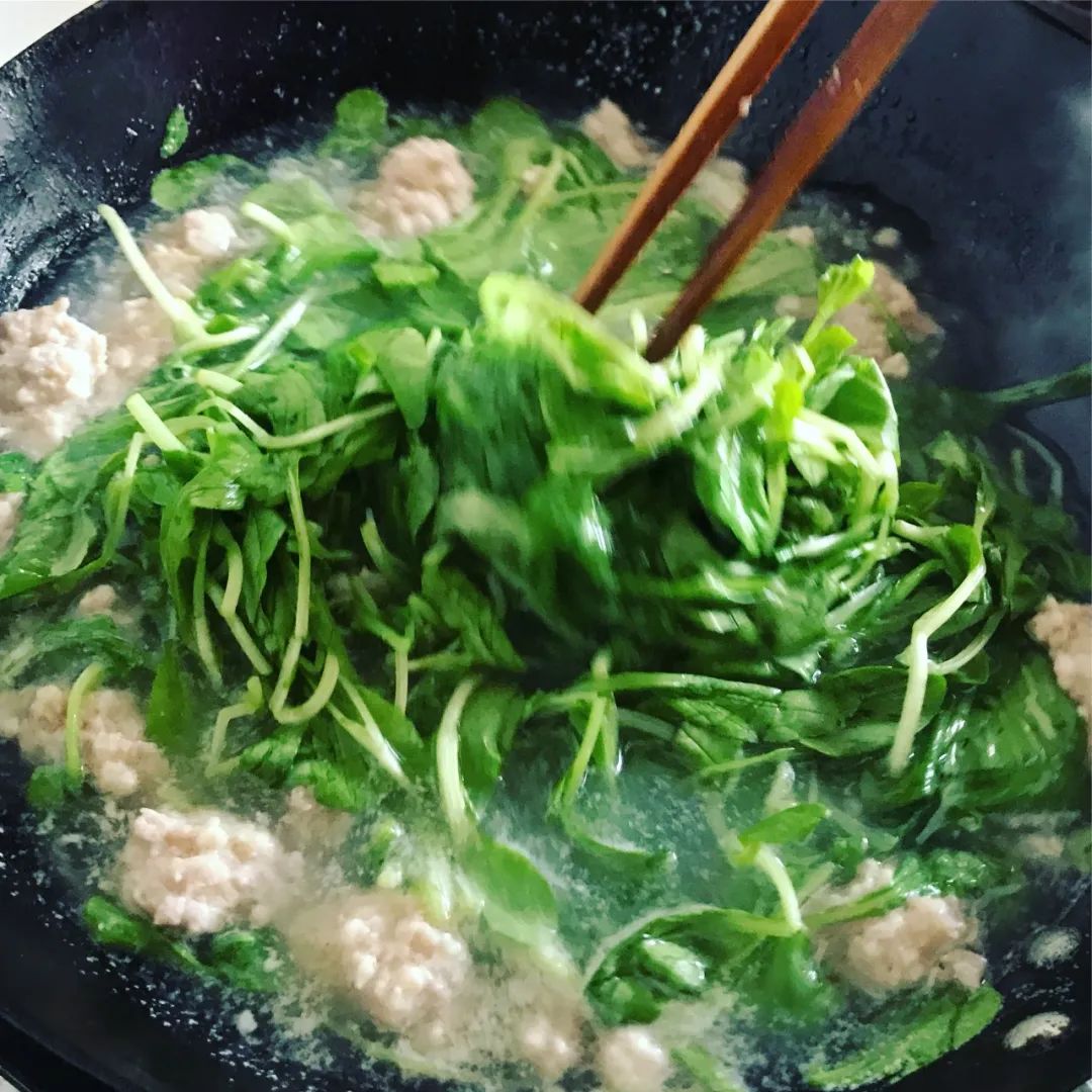●上:枸杞芽;下:野水芹和肉饼丝。