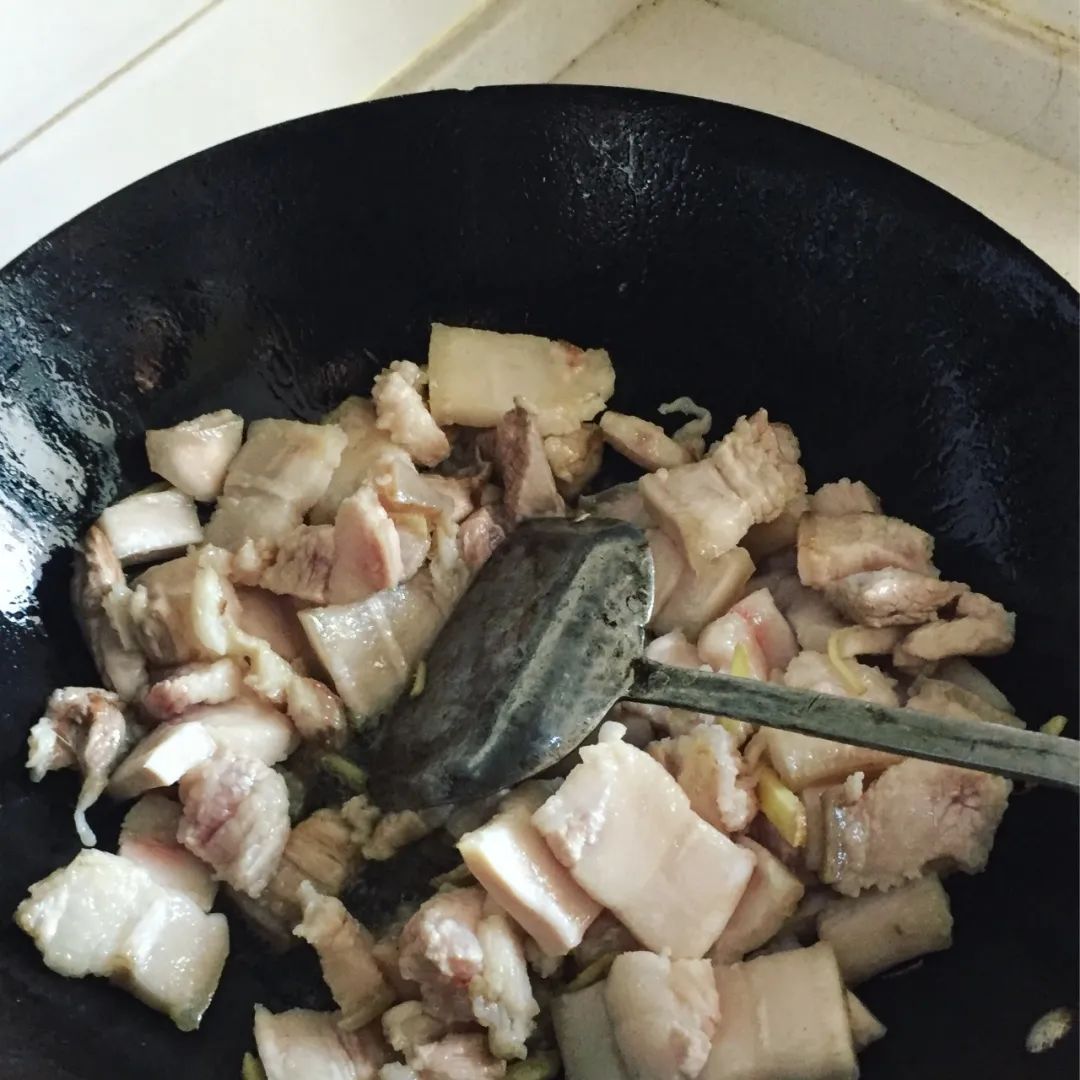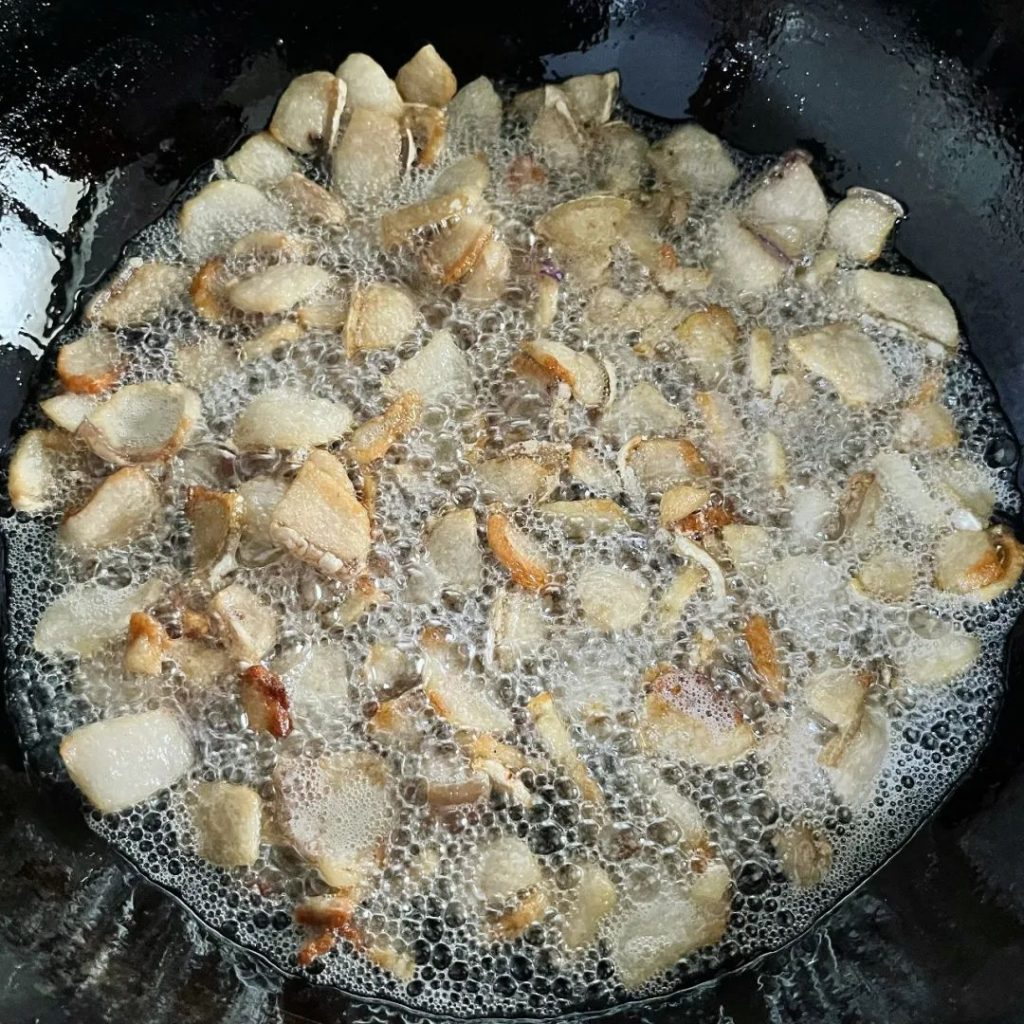●妈妈将猪肉里肥肉切片炼成了猪油。