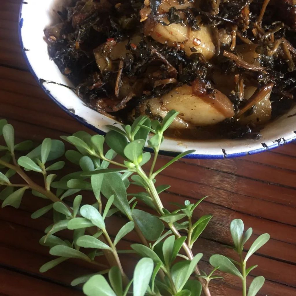 ●上左:泡开的马齿苋,叶片发绿,茎部泛黄。上右:炒马齿苋的猪肉肥多瘦少为佳。下图:17年夏天,新鲜的马齿苋和外婆做的干马齿苋烧肉。马齿苋叶片肥厚多汁,不好晒干。传说此草救过太阳,所以方言里戏称为“太阳杀不死的马齿苋”。外婆的处理,是先用灶膛里的草木灰来“杀水”,之后再晾晒。