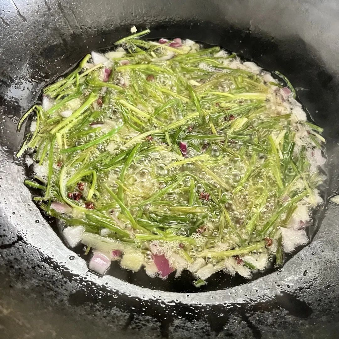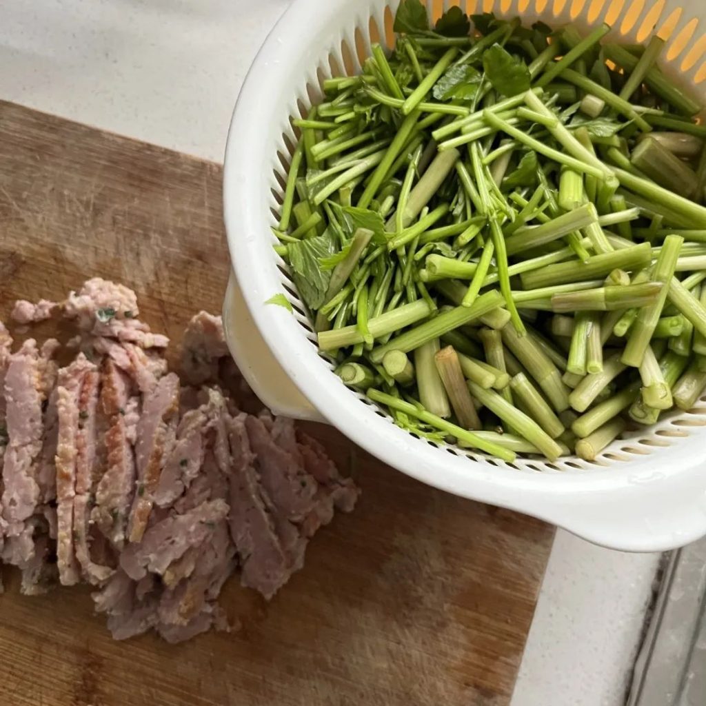 前日的肉馅放重了盐,将之先摊饼再切丝,炒野芹正是一口咸鲜,下饭得很。王西楼《野菜谱》中歌枸杞头:采春采夏还采秋,饥人饱食如珍馐。春天即是采食嫩梢,不加蒜也不炝酒,直接清炒,苦中带甜,有万物枯尽而后复苏萌发之意。