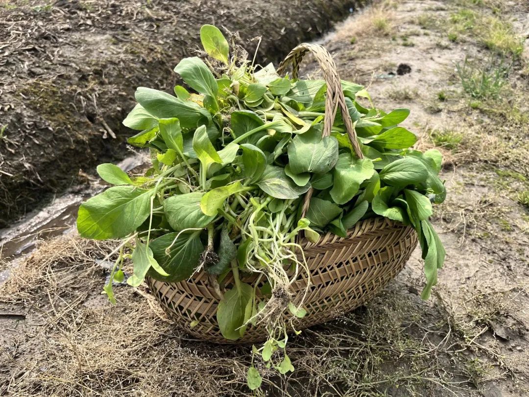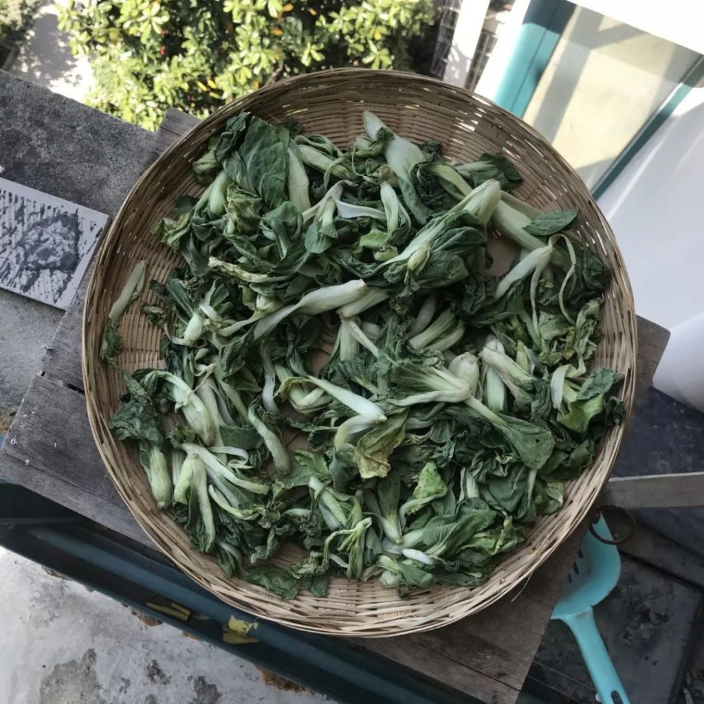 姨妈家的小白菜养在了种大豆的大棚里。最近气温升暖,塑料膜一掀开,热浪从里头扑了出来,大豆高长,小白菜已经完全被豆株遮挡住。这真是最后一批小白菜了,再往后恐怕就要闷死。原本全要拿去喂鸡,结果静态一宣布,拔菜的手也停下了,这才能让我们母女俩装了满当当的一篮子。