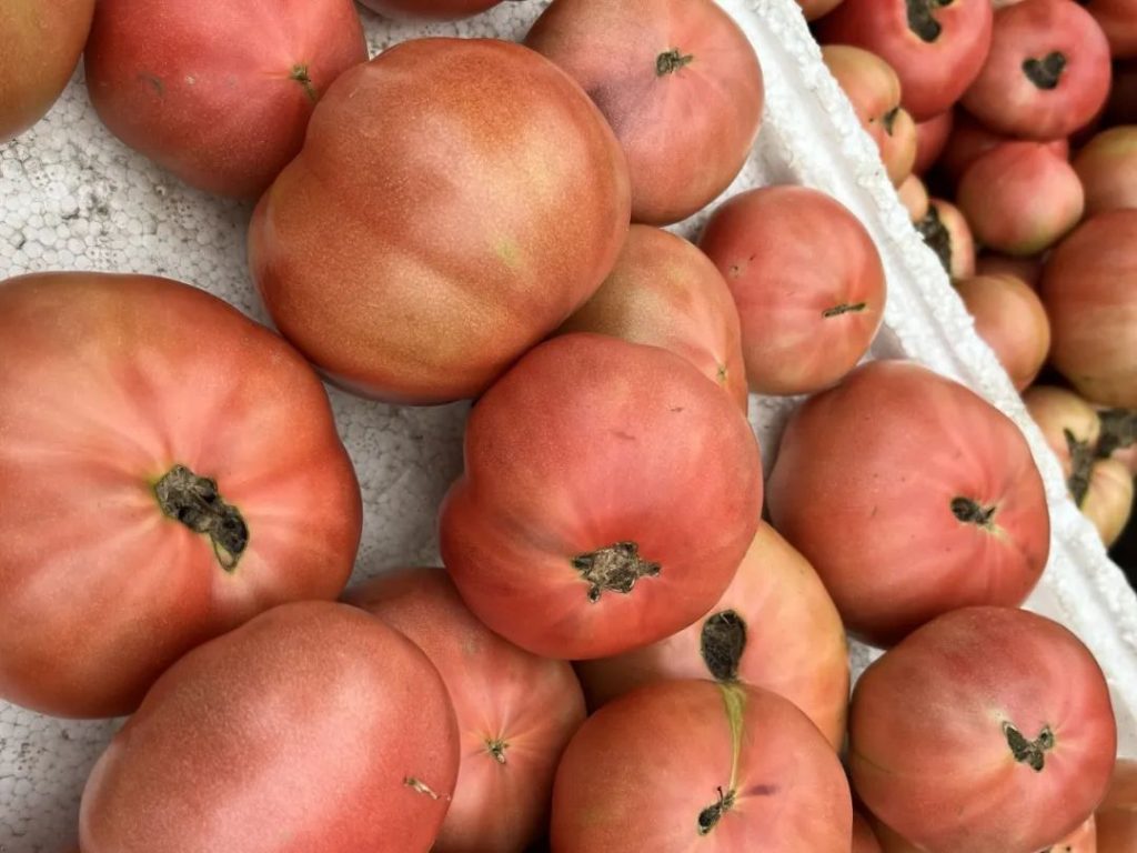 ●妈妈的左手边是本地西红柿,右手边是“洋西红柿”,颜色差异明显。