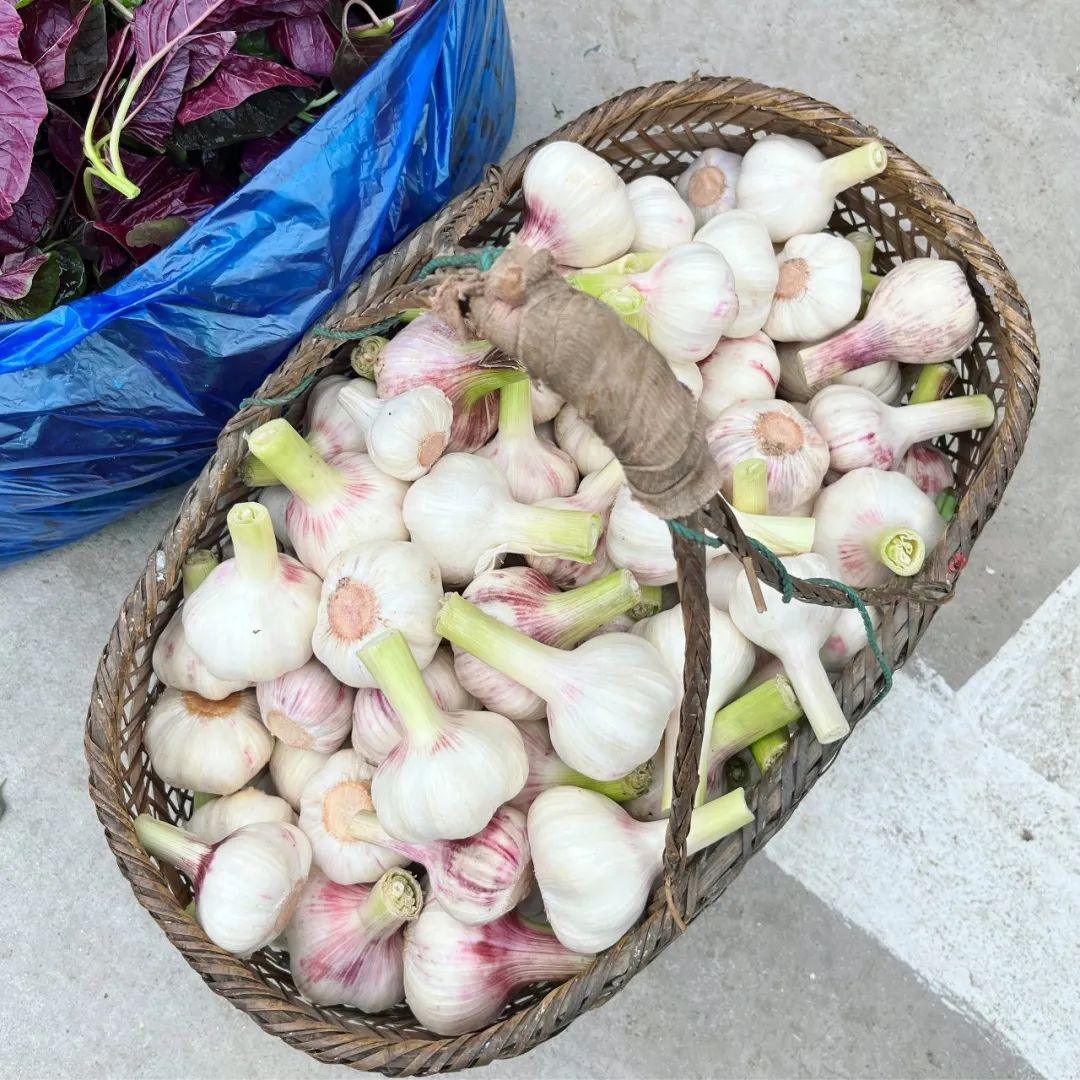 还有小白菜和蒜苔。小白菜(即鸡毛菜)养在大棚里,初春早发,没有虫害,无需用药,一把鲜嫩,用来下汤正好。等到再长大些,放到太阳底下暴晒两天,就着半干未干,切碎拌盐做成“半腌菜”,早晨可用来佐稀饭。蒜苔则是本地的早蒜苔,颜色黄绿,较外地“洋蒜苔”,口感绵软,炒咸肉尤佳。