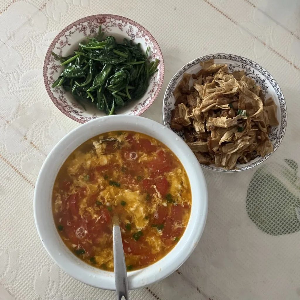 野菜为绿茎商陆,非有毒的紫茎商陆。清炒之,尝起来像是酸口的菠菜。前几日炼猪油剩下的油渣,与泡发的油豆皮红烧,即可算作荤菜了。西红柿还是上次早市所购,还剩两颗,可做两顿蛋汤。如此,度过了静态下有荤有素有汤的第一餐。