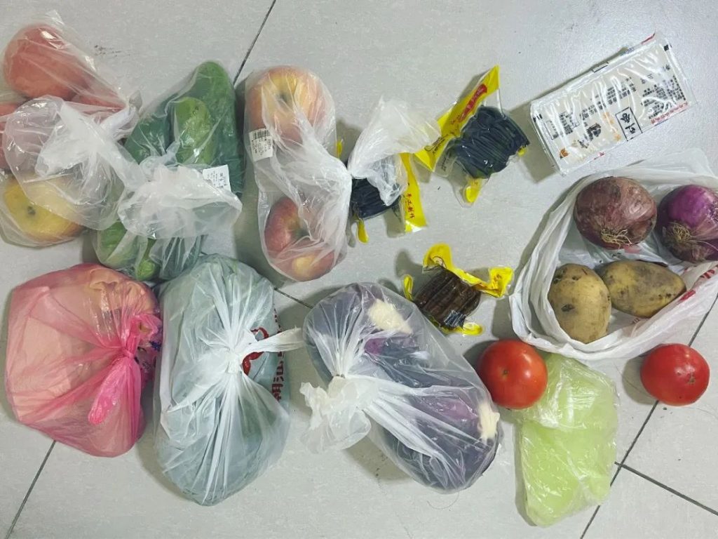 老板娘给妈妈发了视频过来,超市里的很多菜都已烂掉。挑挑拣拣,最后买了洋葱、土豆、苹果、黄瓜和紫甘蓝,唯一的绿叶是韭菜。又从厂里带了些豆腐、香干和千张,还在自家厨房匀出了两颗西红柿,一并送来。