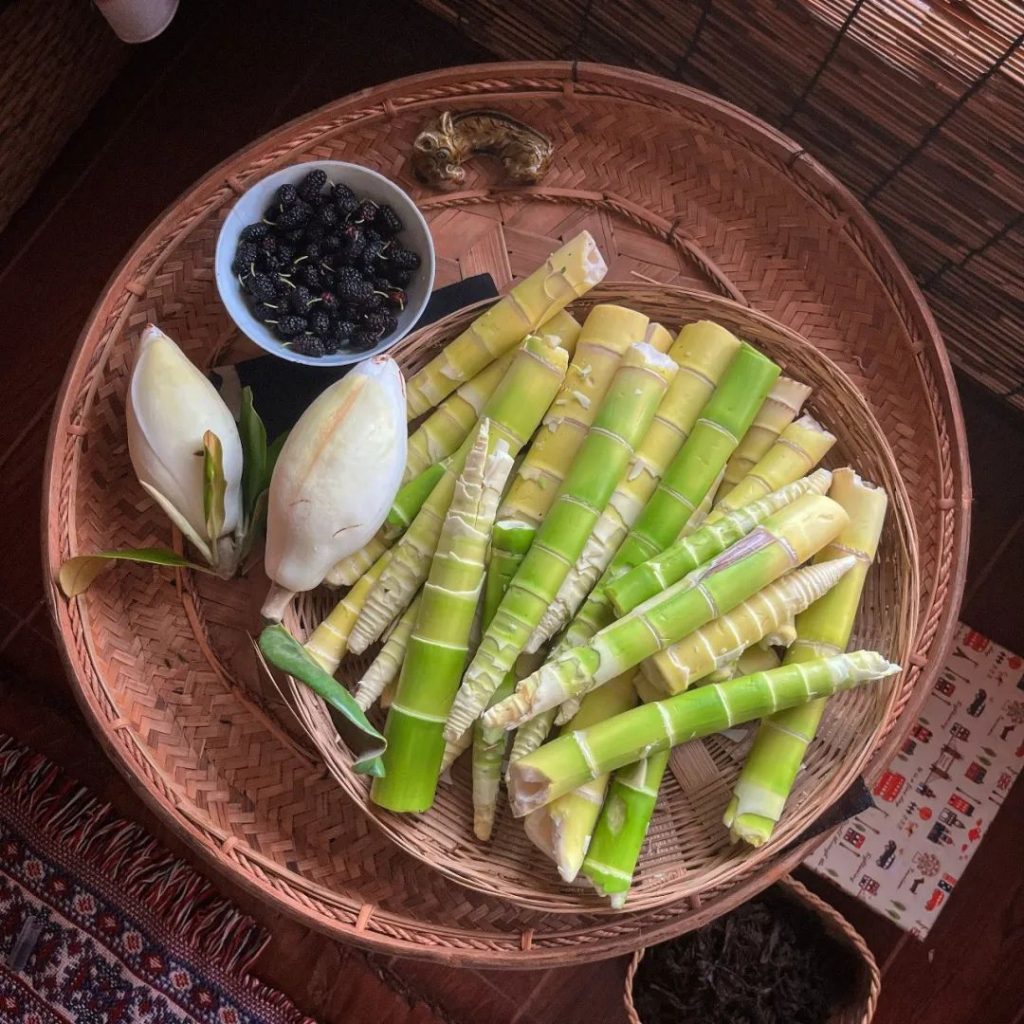 ●立夏后,母亲节前夕。妈妈下乡,这次如愿挖到了竹笋。还采回了野桑葚,折了两只广玉兰花苞。