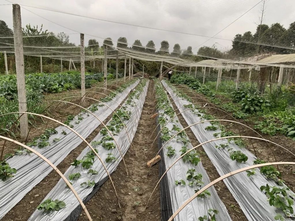 陈英阿姨说,她也试过秸秆,但是会有虫子钻出来,吃掉草莓果。薄膜的好处则有很多,既能防虫,也可以给土壤保温保湿,光滑的表面使它很容易排水,草莓接触地膜的地方不会因过于潮湿而腐烂。她也想过用去年的薄膜,可是薄膜上撕开的口子和今年草莓苗的位置对不上,所以没法用。