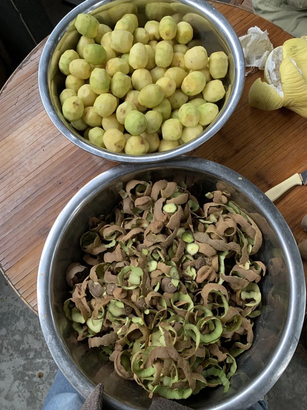 水果不能简单靠晒制了。农场购置了一台小型烘干机,春季剩下的草莓、夏天吃不完的桃子、秋天最后的猕猴桃,都会切片后烤制成干,作为日常零食。今年制作猕猴桃干时,我出任了削皮环节的负责人,不能下地干活的雨天,最适合坐在庭院的遮雨棚下削皮了。