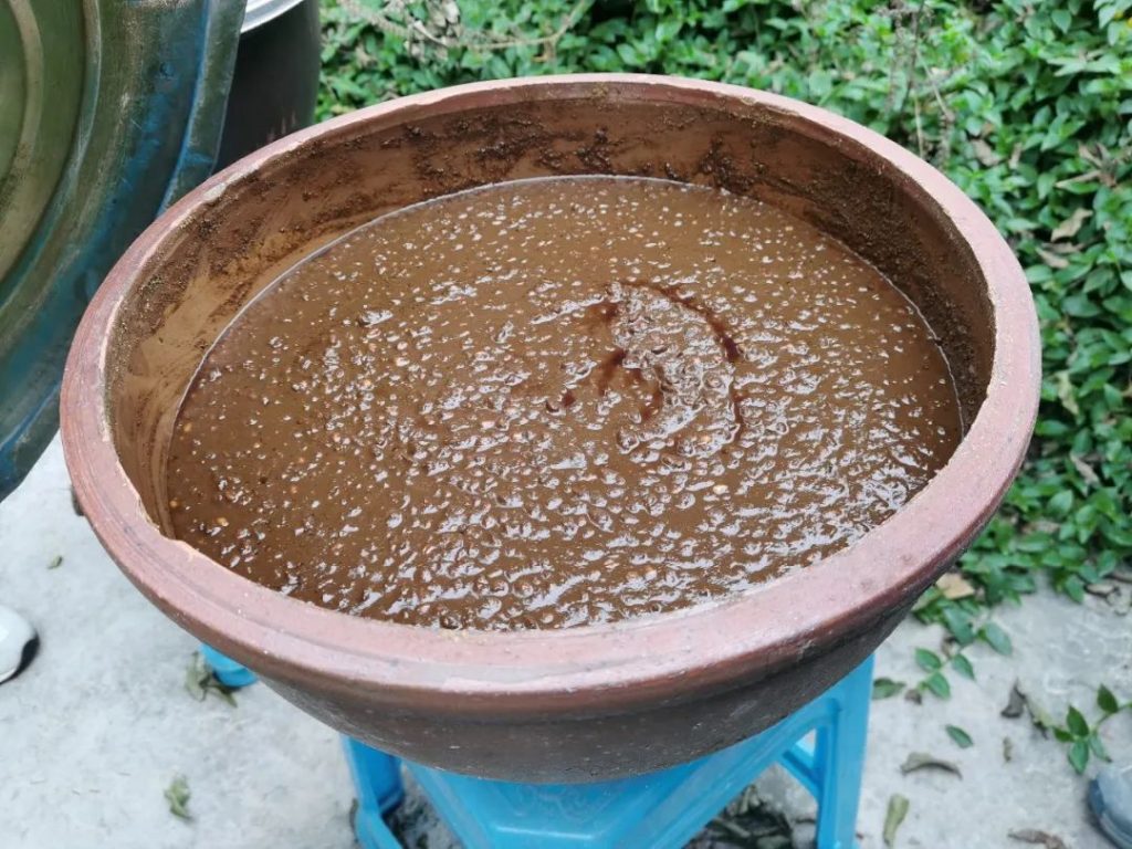 农场前院的五六口大缸里,晒制着豆豉、甜面酱和麦酱等好些酱。需要时时观察、翻搅,使它们不要过干或过湿。翻搅的工作不是什么省力的活儿。有一次我帮忙翻搅了三缸酱,足足花了一上午。酱入空缸之前,必须用高度白酒消毒,避免杂菌污染。把酱从缸舀入窄口罐就更加考验耐心了。我得屏住呼吸,保持手臂平稳,多深呼吸几次让自己不要急躁,感觉所有的脾气都磨没了。