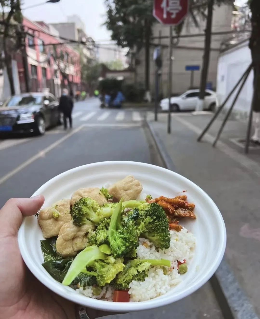 有一天,刘大树同学来打饭,端着碗走到楼下就晒了一张图,说在玉林的好处就是有小饭桌,喜悦心情可见一斑。我想除了能吃上健康餐,他还开心于自己真的做到了“早起”。